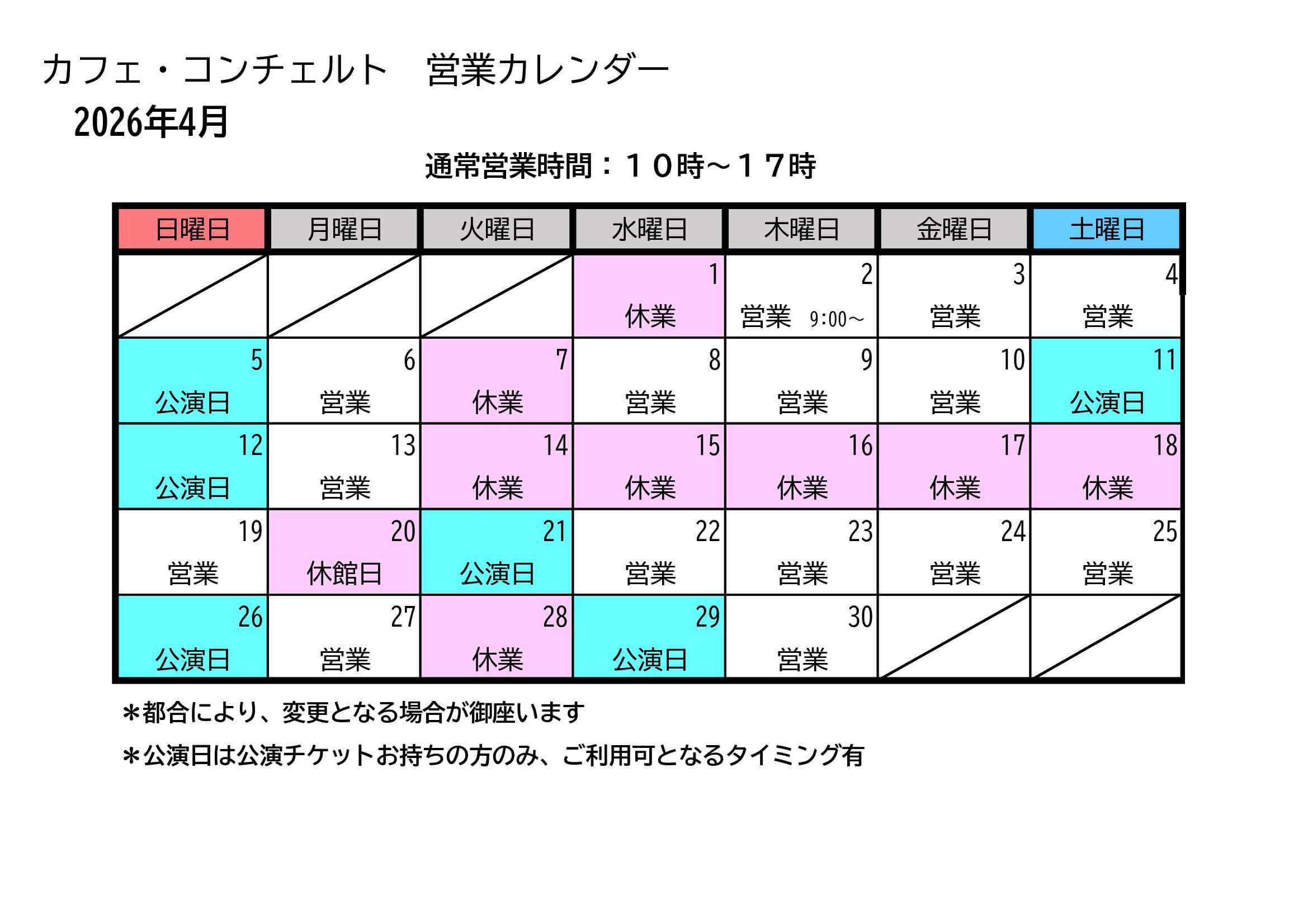 3月カフェ・コンチェルト営業のご案内